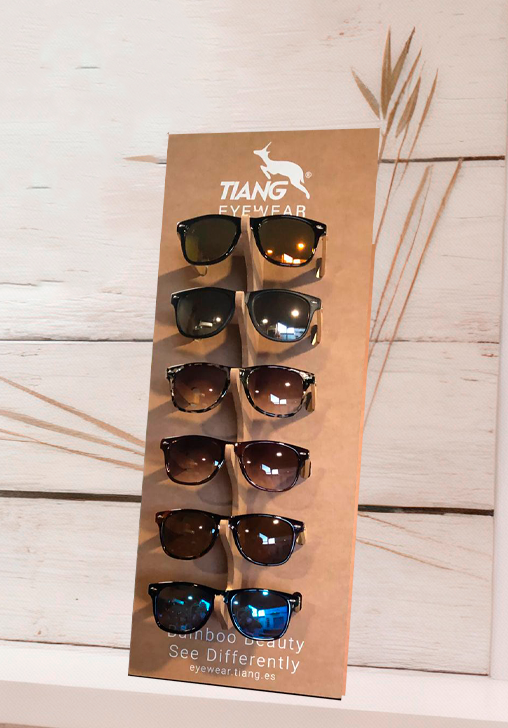 Nuestro expositor de cartón reciclado te permite coleccionar y organizar hasta 6 gafas TIANG mientras las mantienes siempre a la vista.